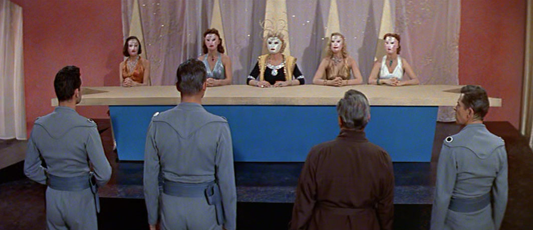 Three American astronauts – Captain Patterson (Eric Fleming), Lt. Cruze (Dave Willock) and Lt. Turner (Patrick Waltz) – and a professor (Paul Birch) are on a new mission and will be the first men to travel to Venus. To their surprise, they find the planet to be much more Earth-like than they had ever imagined – aside from the fact that it’s inhabited by only women, ruled by a Queen of Outer Space, Yllana (Laurie Mitchell) who hates men.