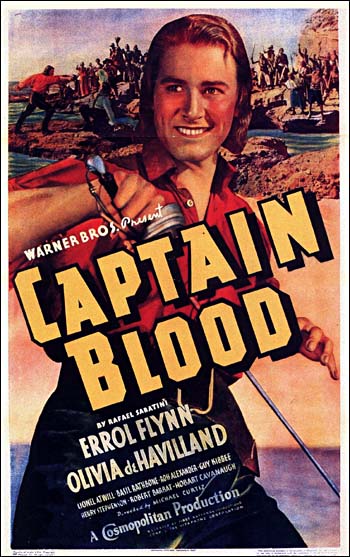 Captain Blood, the 1935 Warner Bros. film based on Rafael Sabatini’s 1922 novel Captain Blood: His Odyssey, was one of a handful of films that heralded the return of the swashbuckler’s popularity. The plot is simple: honest doctor Peter Blood is sent to the Caribbean as a slave because he provided medical treatment to a rebel; from there, he leads other slaves into escape, becoming one of the more feared pirates in the Caribbean.