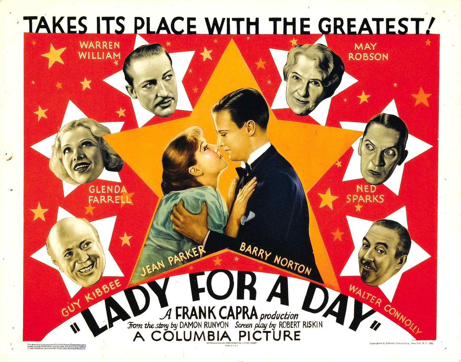 Frank Capra directs the dramatic comedy Lady for a Day, adapted from Damon Runyon’s short story Madame La Gimp, which was originally published in a 1929 issue of Cosmopolitan. The film was nominated for four Academy Awards: best performance by a lead actress, best director, best picture and best adapted screenplay.