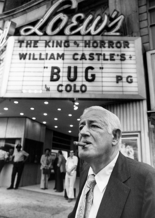 Castle-inspired touches are peppered throughout the entire film. Lawrence Woolsey could not be a more perfect spoof of the real-life director. Right off the bat he’s referred to as “the screens #1 shock expert” and “the master of movie horror.” Castle used similar terms to describe himself in promoting his films. (Check out the marquee in the photo to the right of Castle at a screening of his film Bug!)
