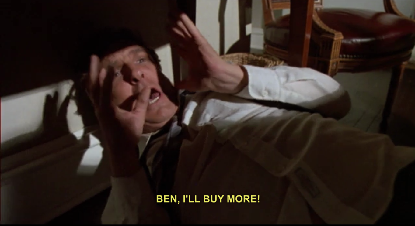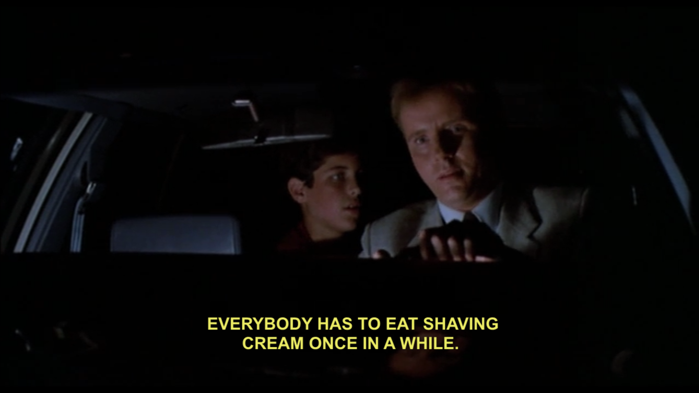 Jason’s troubles don’t end with a bit of grocery store havoc. His family has, unfortunately, fallen victim to “The Stuff.” They want him to eat “The Stuff” so he can become a part of the family again, and when they find out he’s only pretending to eat it, they chase him out of the house! This is how the dream-team of Rutherford and Jason is born. Rutherford is full of good advice for his new investigative companion: