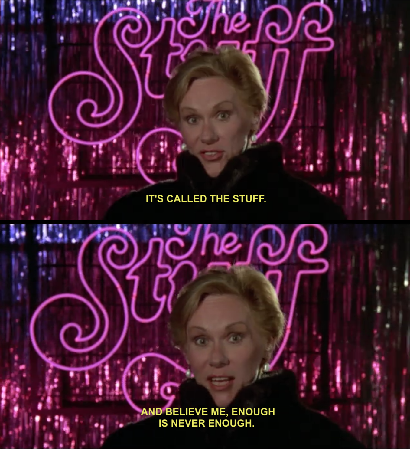 Oddly enough, I have one more movie to add to my short list of Netflix discs that remain to be rented…the thirteen I have time to watch before I move and am forced to bring an end to my subscription (which will also free me up to watch the 700+ movies I have waiting on my big DVD tower). I will now add ‘The Stuff’ to that list!