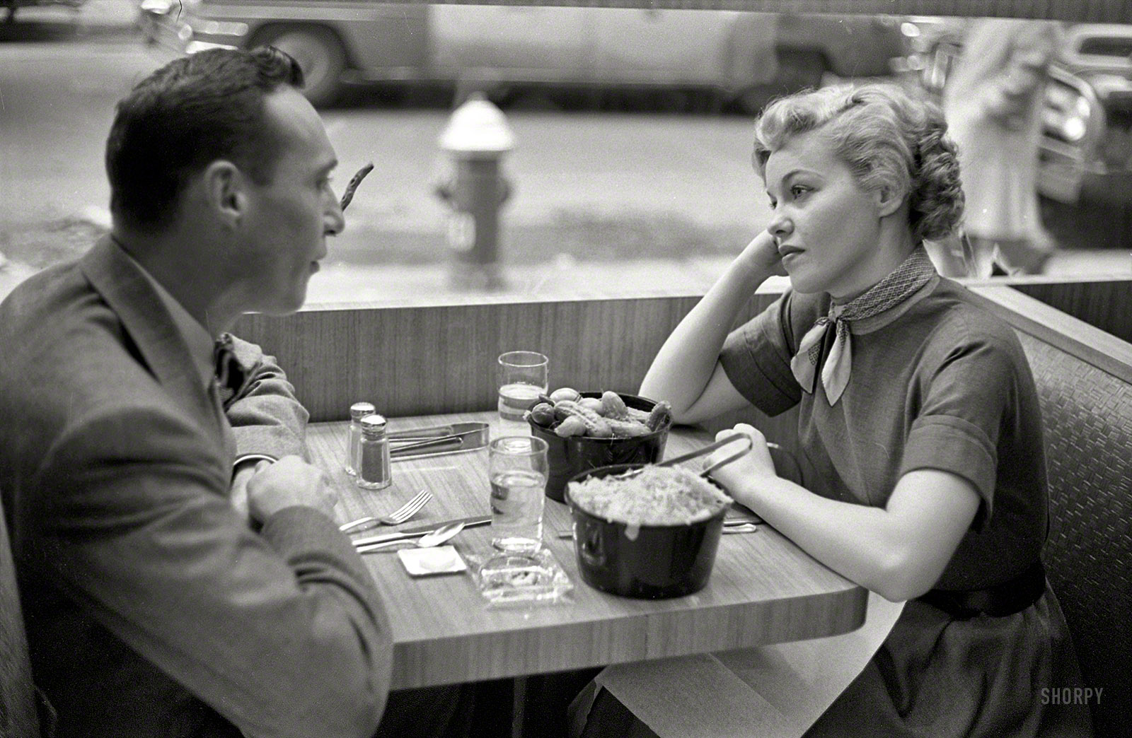 Jaye P. Morgan dines with a friend in 1954. I hope she let her date order those dills and kraut! (Image via Shorpy)