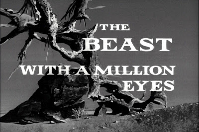 “I need this world. From millions of light-years away I approach your planet. Soon my space ship lands on Earth. I need your world. I feed on fear, live on human hatred! I, a strong mind without flesh or blood, want your world! First, the unthinking — the birds of the air, the animals of the forest — then, the weaker of men shall all do my bidding. They shall be my ears, my eyes, until your world is mine! And because I see all of your most secret acts, you will know me as The Beast With a Million Eyes!”