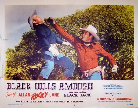 This is part of a series of over thirty B-westerns in which Allan Lane starred as “Rocky,” one of his most famous roles. All thirty-something of these films were released between 1947 and 1953, so Black Hills Ambush comes somewhat late in the series. Lane is also known as the voice of the horse (of course, of course) on televison’s Mr. Ed.