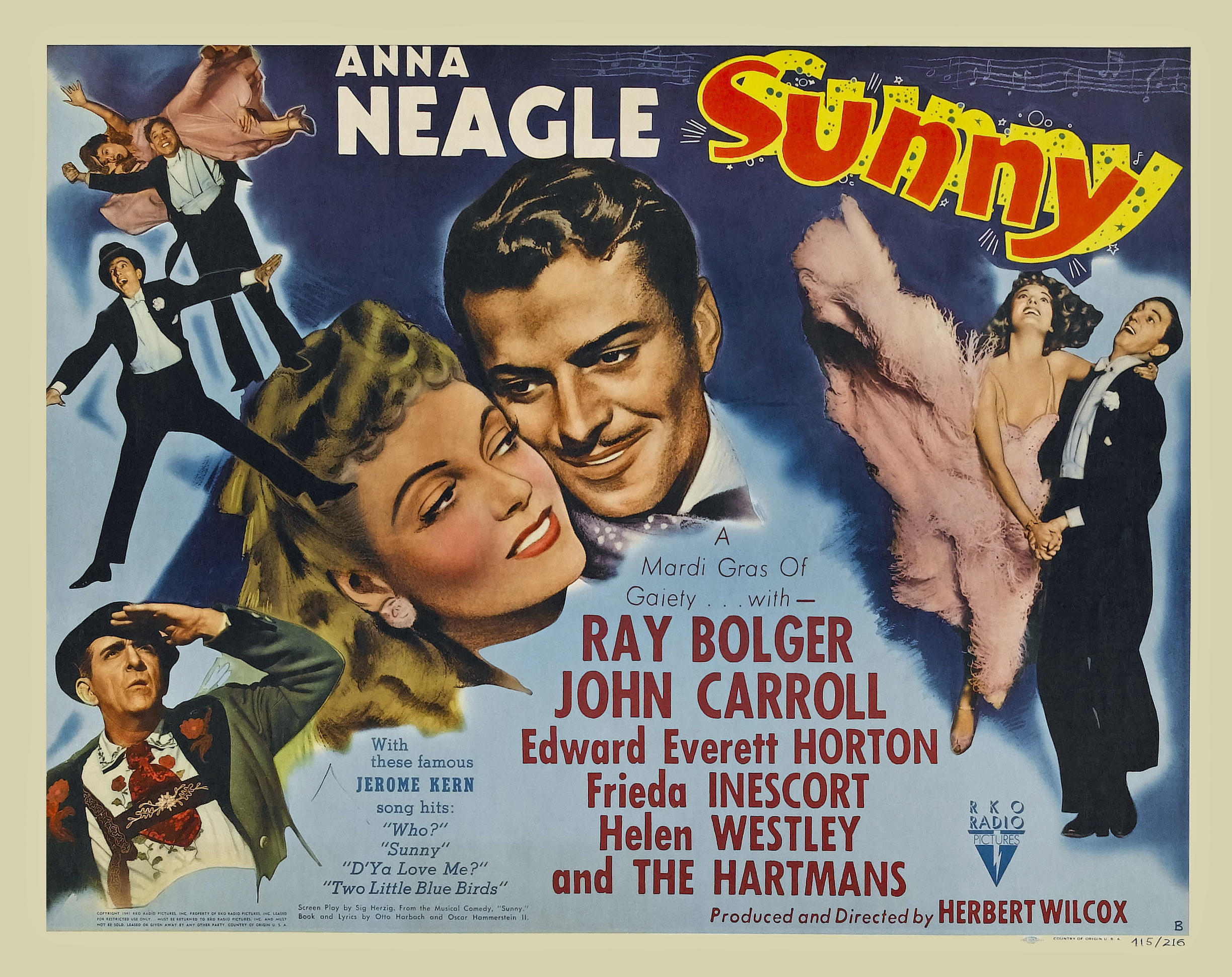 Sunny was released in 1941 and is now in the public domain, appearing in Mill Creek’s 50 Classic Musicals set. It was directed by Herbert Wilcox. The film is a remake of a pre-code musical of the same title, which was released in 1930 and starred Marilyn Miller.