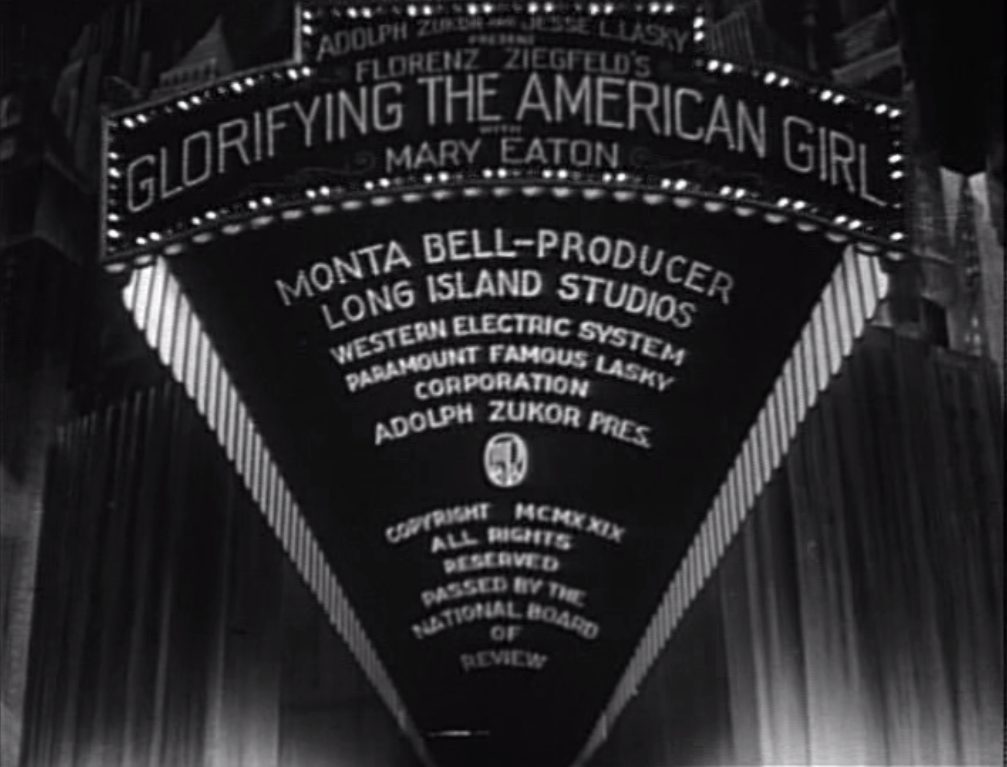 Glorifying the American Girl is an early talkie, released in 1929 and directed by John Harkrider and Millard Webb. Cameo appearances are made by plenty of big names including Irving Berlin, Eddie Cantor, Rudy Vallee, Johnny Weissmuller, Adolph Zukor, Billie Burke and even Flo Ziegfeld himself.