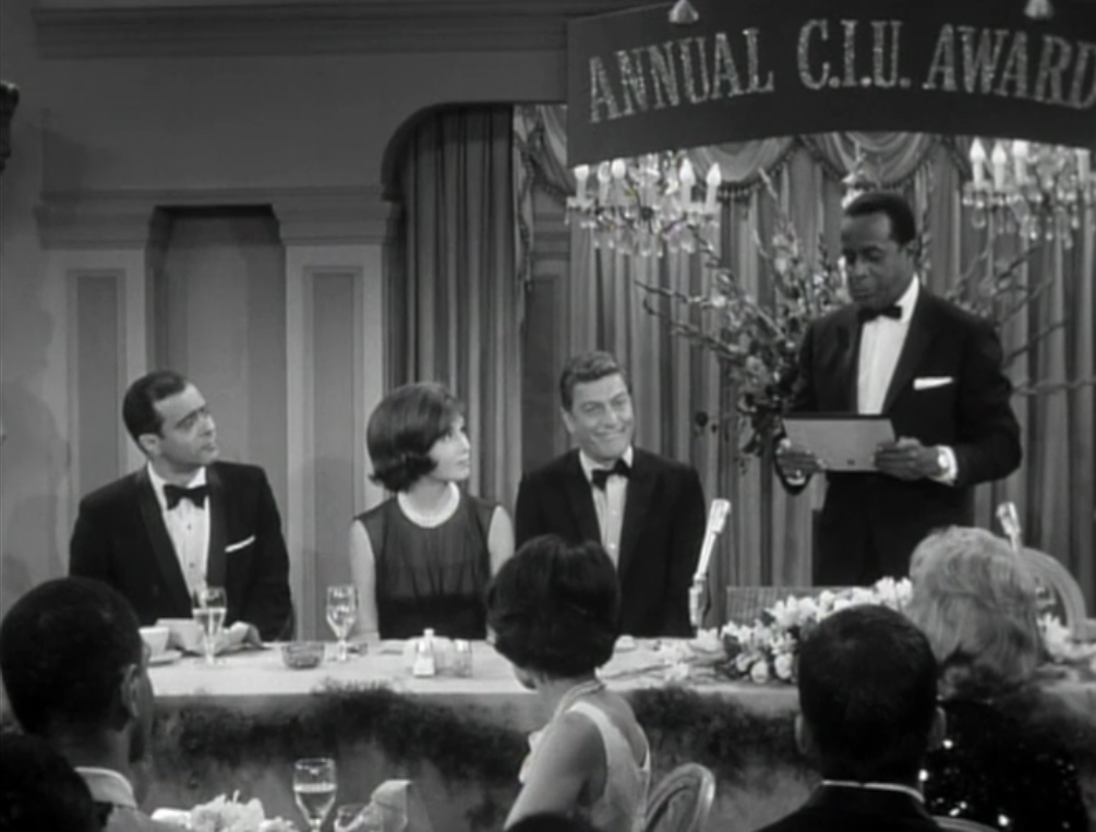 Reaction: I had never seen this episode previously, and the synopsis had me a little hesitant to watch it. The subject matter is handled much better than I expected it to be — Millie suggests that Rob plays the dyed hands off as a gag, and Rob points out that it would be in very bad taste to do so. They try to resolve the issue by wearing gloves, but after Rob hears the presenter say that “Truth is the doorway to understanding,” he decides to be honest about it, and everyone laughs over the mishap. Rob delivers a few very poignant lines, as well, after the gloves come off: “As I look around the room now, I see that all my fears and all my embarrassments were self-imposed. I can’t wait ’til a day when understanding is, between everybody, such a commonplace thing that they don’t have to hand out awards for it.”