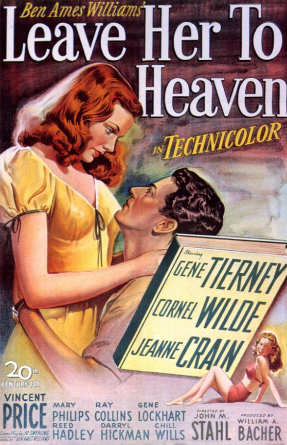 Jo Swerling wrote the screenplay for the film adaptation of Leave Her to Heaven, and it’s a very nicely-executed transition from page to screen. Swerling captures all of the novel’s suspense and surprises. Some plot points, of course, are removed or made less time-consuming, as is always bound to occur when a novel is adapted, but the spirit of Ames’ novel is captured well.