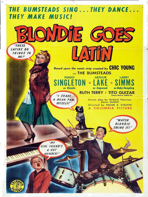 Blondie Goes Latin (1941) – With a title like Blondie Goes Latin I wasn’t quite sure what to expect from this one. The potential was there for it to go terribly wrong. Luckily, it’s your standard, light Blondie installment – a tale of a trip south of the border with Mr. Dithers, wherein silly ol’ Dagwood must disguise himself as a member of the ship’s orchestra after he nearly misses the boat. Fun musical numbers keep the boat afloat in this slightly-more-dramatic (but still quite funny) eighth film in the series. Guest starring Ruth Terry and Tito Guizar, with music and lyrics by Bob Wright and Chet Forrest.